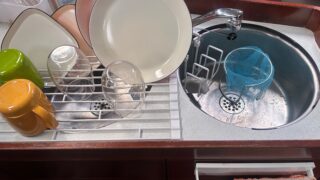 今週は小ネタ。小ネタではあるんだけど、ギャレーの使い勝手が劇的に改善したのでご紹介します。これは、ニトリで売っていた「折りたたみ水切りラック」という便利商品。うちのギャレーは、ごく一般的なL字型で、丸いシンクが2つあるタイプ(この写真はカタ...