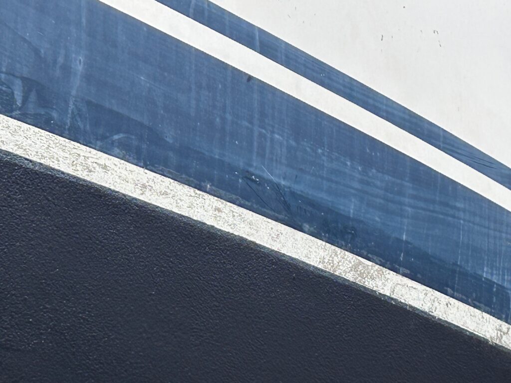 数年前にマスキングテープを剥がし忘れて数日置いてしまい、上手く剥がれずに、白線の部分に接着剤がベタベタ残っちゃったんですよね。そのせいで、マスキングテープが剥がれにくいし、汚れも目立つようになってきたので、綺麗にしたいのですが、ラベル剥がしなどを使わないと取れないので、塗り終わった後では掃除できないんです。来年は上架したら、まず白線のお掃除から始めるのを忘れないようにしないと。