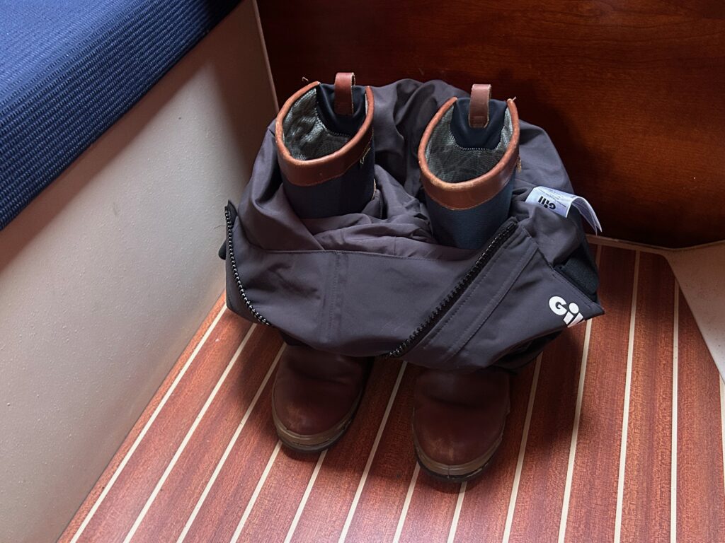 ただ、これが外洋だったり荒天だったりの時にはそういう訳にいかない。キャビンへの出入りは一番危険な瞬間でもあるので、キャビンからデッキに出てくる時には完全装備で出てきて欲しいし、そもそもブーツとカッパは一緒に脱いで置いておくもの。