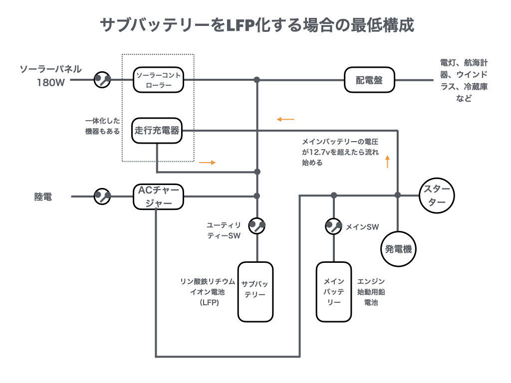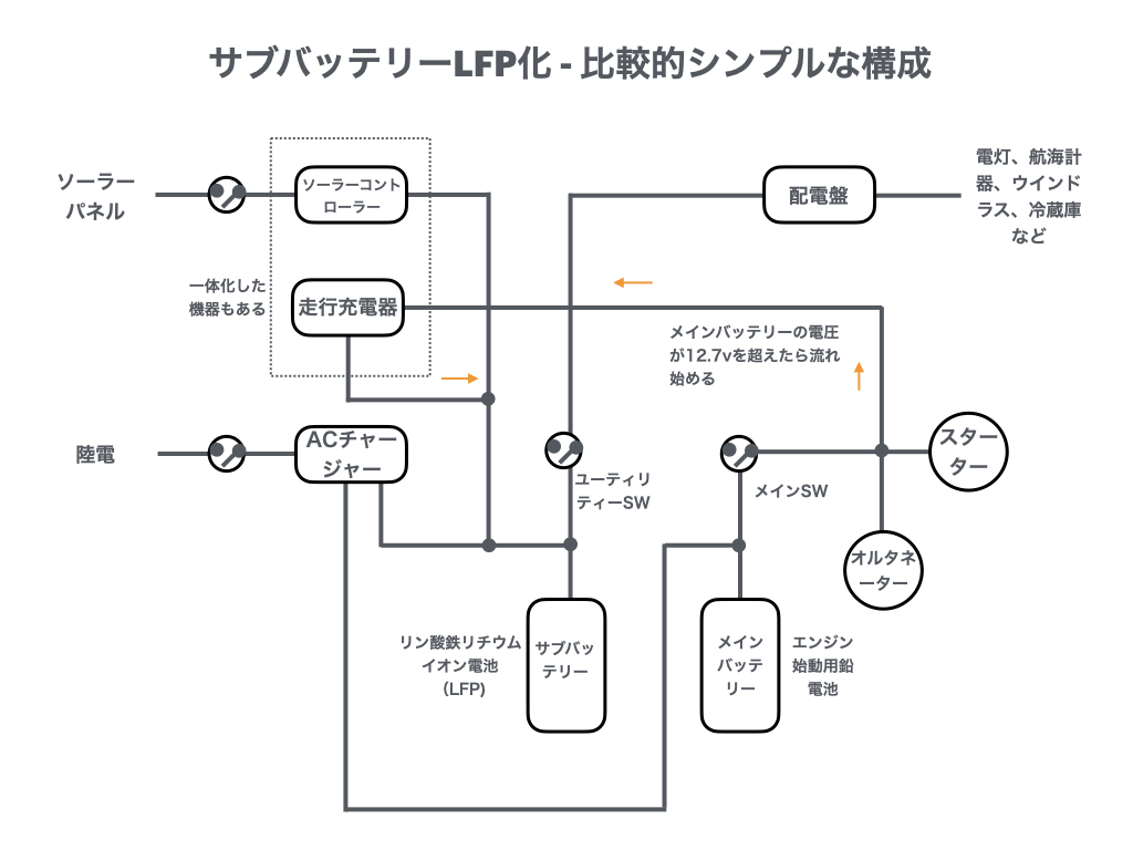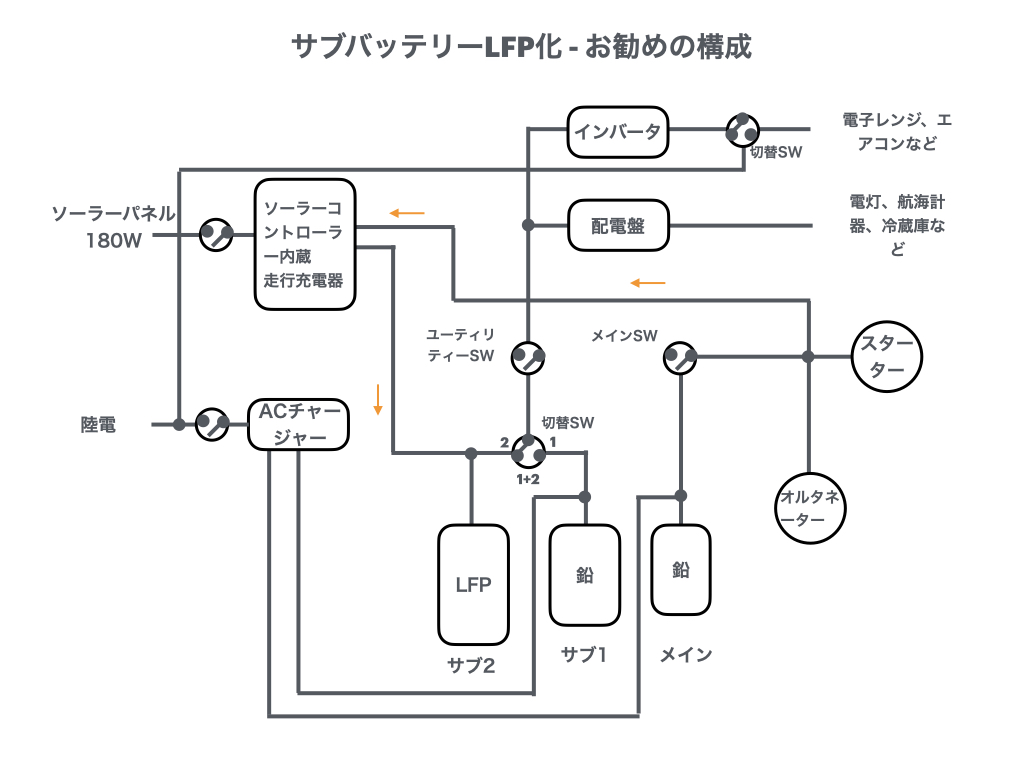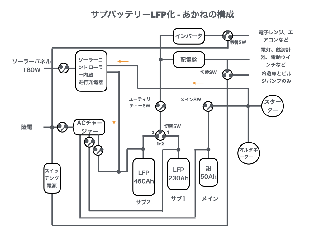 - 巡航中は、セレクタを「2(LFPのみ)」にして、サブ2系列のみ使用する。エンジンからは走行充電器でサブ2系列(LFP)に充電する。なお、サブ1系列にも充電したいときは、セレクターを「1+2(Both)」のポジションにすれば、LFPの方が電圧が高いので、鉛電池に優先的に充電され、その後LFPに充電されるだろう。