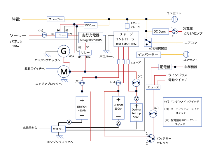 そうすると、これを充電するためには、陸電、ソーラー、走行充電と総動員することになり、それらが相互干渉しないための工夫が必要になる。しかも、後でわかった事だが、LFPは、保管時のSOC(State of Charge、充電率)を50-60%に留める必要があるとの事(フル充電で置いておくと寿命が縮まる)。うちの船では、冷蔵庫が常時稼働しているので、ACチャージャーを切った状態では充電・消費のバランスを取るのが難しく、苦肉の策でACチャージャーとは別系統で、陸電から12V電源を取り出してこれらを稼働させる仕組みを付加することになった。