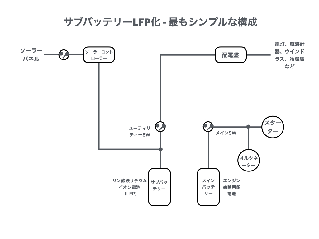 というわけで、まずLFP一個の比較的シンプルな構成を考えてみる(図ではヒューズを省略していますが、適当なものを別途入れてください)。