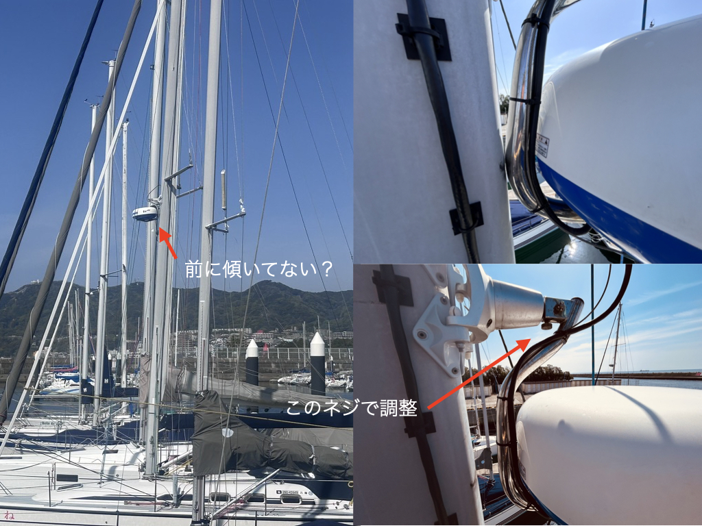 前から気になっていたのですが、少し前方にもたれてますよね。このレーダーはジンバルに載っているいるのですが、左右にスイングするときにマストを擦るようだとまずいことになるので、マストに登って点検することにしました。