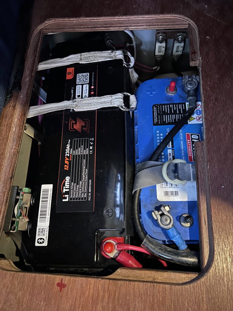 先週、エンジンの始動が良くない症状が出て、グロープラグ(予熱ヒーター)用のリレーを交換したら改善したのですが、その時、念の為に測ったバッテリーのCCAが新品時の80%まで落ちていたので、そろそろ換え時と判断しました。元々ついていたのは、オプティマのレッドトップ(始動専用のお高いやつ)で、同じものを買うと高いのと、以前ハウスバッテリーをリン酸鉄リチウムに換装した時に余ったほぼ新品のブルートップ(カタログには、始動とハウス両方OKと書いてある)が余っていたので有効活用することにしました。ただ、そのブルートップは、75Ahの一番大きいやつで、そのままでは入らない。固定用の仕切りを外して取り付け直したり、わずかに足りない天井(キャビン側から見たら床板)を削ったりとか結構苦労しました、