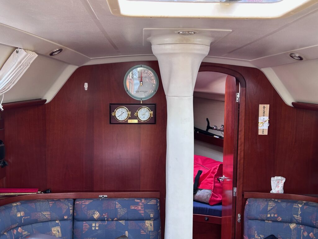 最後に傾斜計をつけました。今もコックピットに貼り付けるおもちゃみたいなのはあるのですが、ちゃんと最大傾斜が残る本物の傾斜計が欲しかったんです。本船から取り外したやつをヤフオクなどで売ってないかとずっと見てたのですが出てこず、昨今の値上がりブームの影響を受ける前にと思って、思い切って新品を注文しました。簡単な機構なのですが、滅多と売れるものでは無いので、結構お高かったです(7万円弱)。が、しかし、これはでデカい!他に付けられるところが無いので船内のバルクヘッドに取り付けました。大きいのでコックピットからも良く見えますが、いくぶん殺風景ではありますな。「あかね?ああ、あの巨大な傾斜計のついている船ね」と覚えて貰えるならそれも良いかな。ハハハ。
