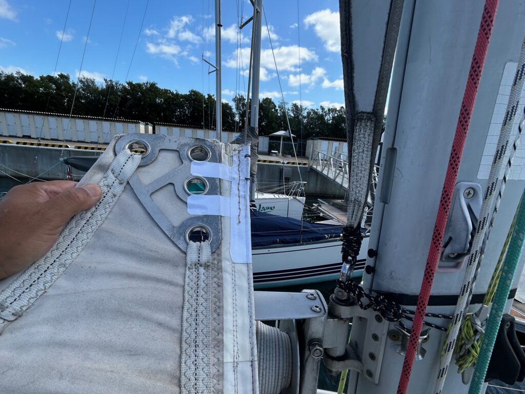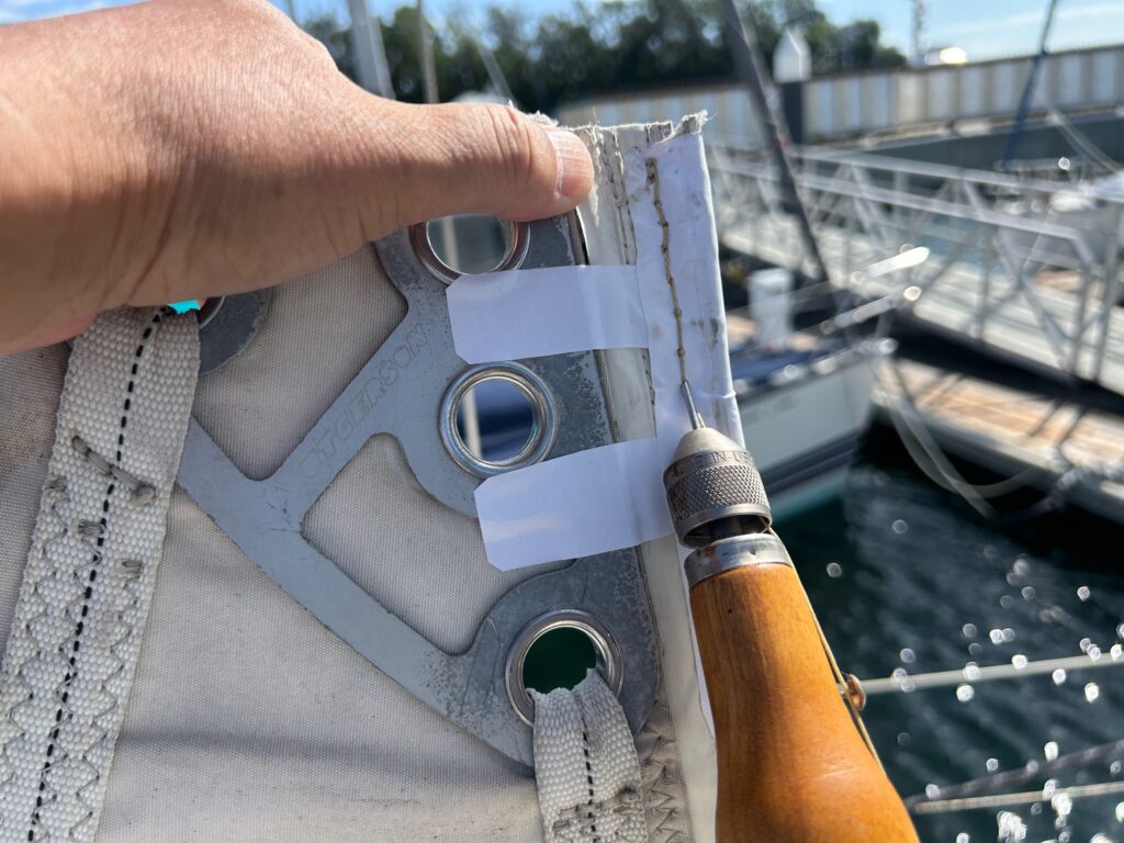 一つ目はメインセールのヘッドボードのところが裂けてきたので応急修理。とりあえずテープを貼って、スピーディースティっチャーでチクチク。