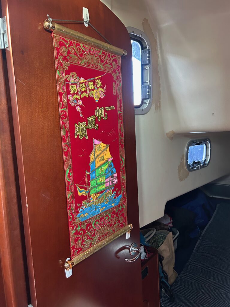 後部キャビンのドアに、縁起の良い「一帆風順」(日本語では順風満帆)の掛け軸。何か良いことがありそうな感じしません?