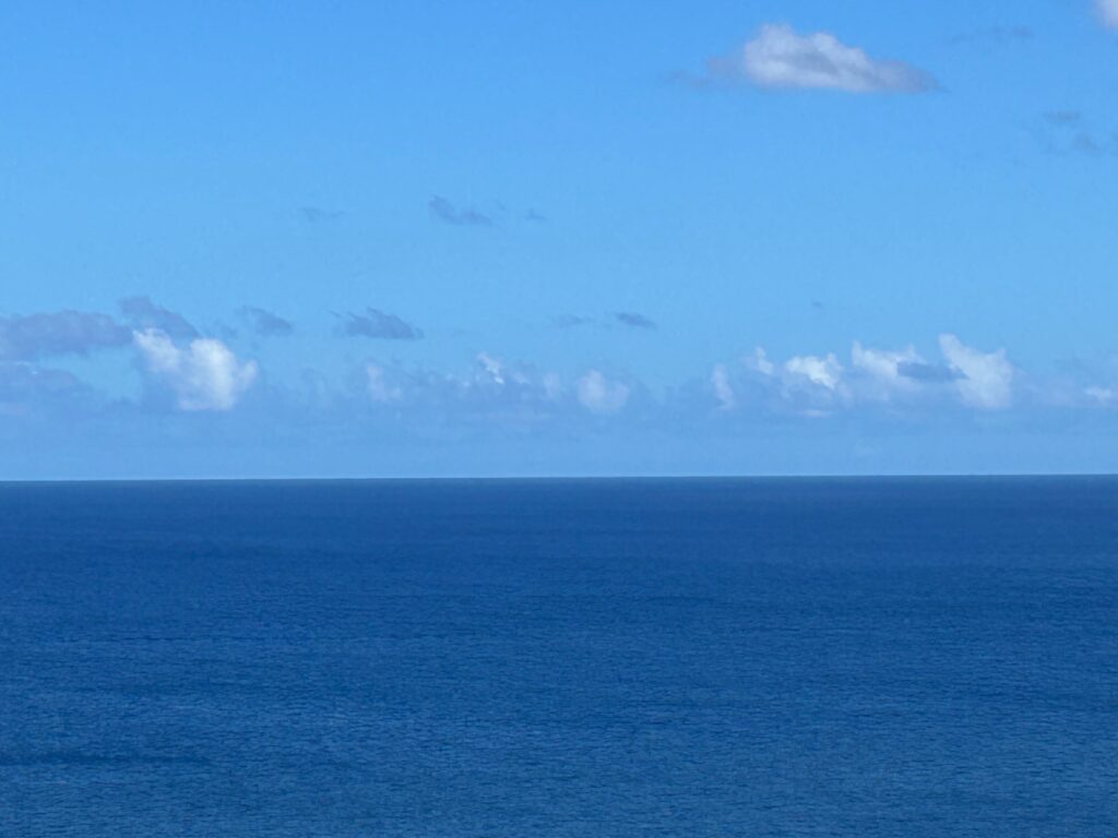 尖閣の方角はこっち。距離が54マイルほどあって、魚釣島の標高が362m、現在地が標高60mぐらいなので、地理学的光達距離は2.08 x (√362 + √60)= 55.5マイル、ギリギリ山頂が見えても不思議はないのですけどね。