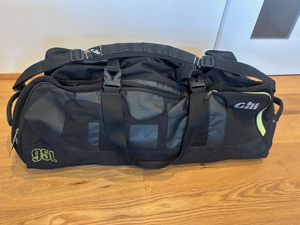 このカーゴバッグは95Lあって、キャスターも付いているので、お他所の船に乗せて貰いに行く時などに活躍するんですけど、底板が柔らかくてクニャッと曲がってしまい、キャスターで引っぱっていたら底の一部が擦れて傷んでしまいました。